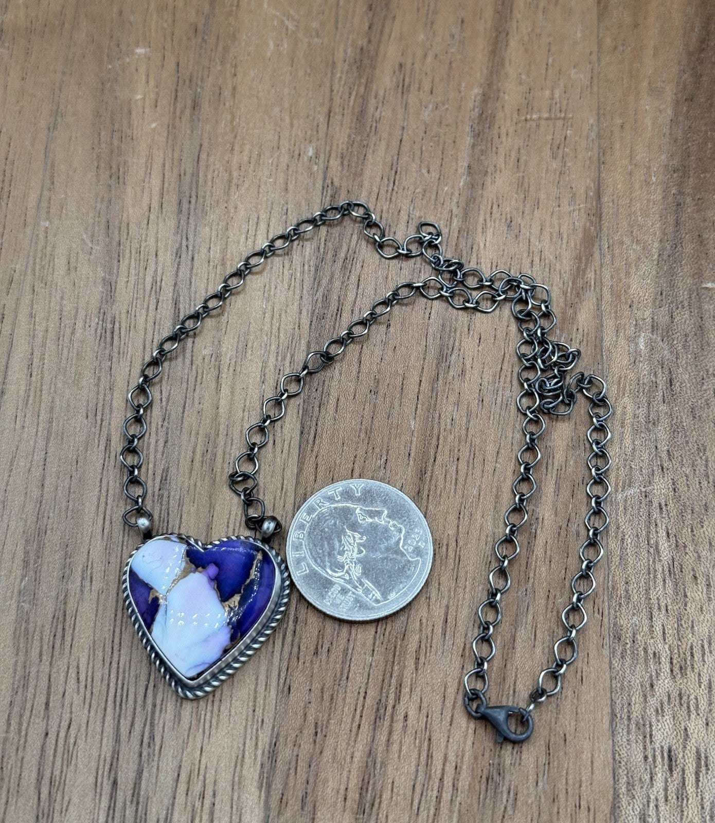 This exquisite necklace is a true work of art handcrafted by Native American artisan Tricia Smith, The stunning bar shaped necklace features a beautiful Violet rose stone (Compressed and dyed material). The pendant hangs on an 18-inch chain with lobster closure, making it a perfect accessory for any occasion.