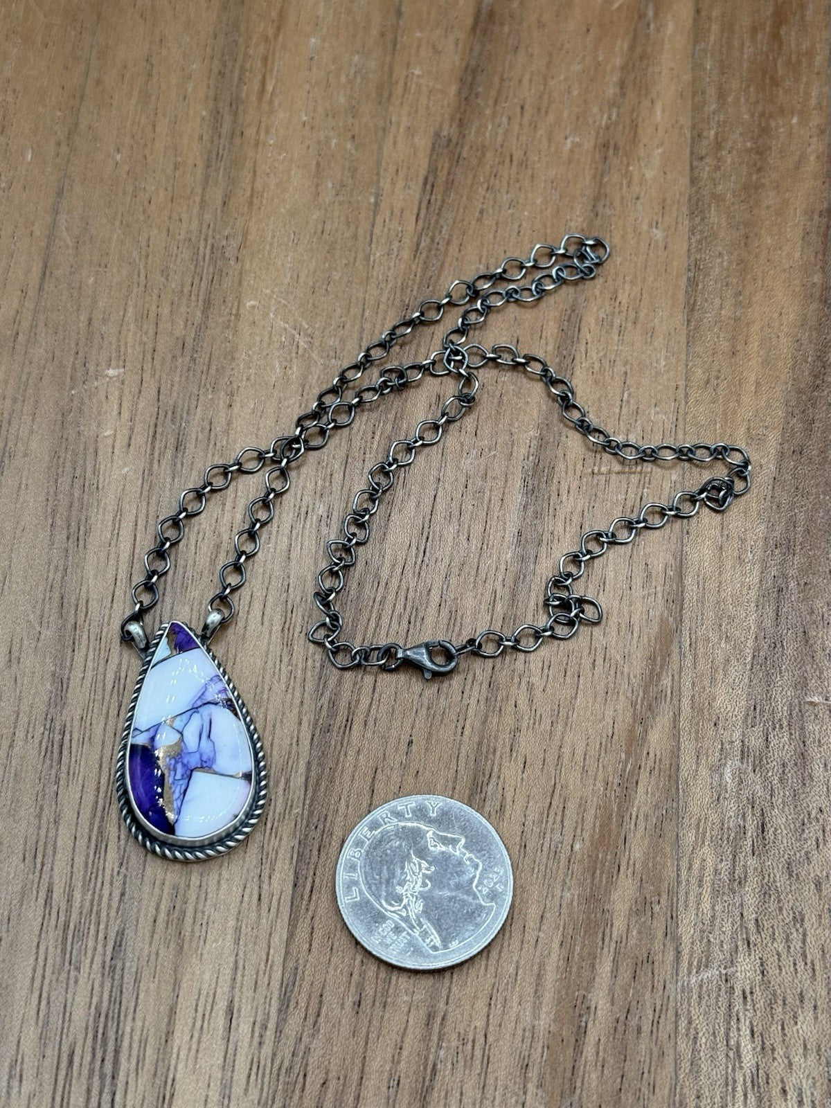 This exquisite necklace is a true work of art handcrafted by Native American artisan Tricia Smith, The stunning bar shaped necklace features a beautiful Violet rose stone (Compressed and dyed material). The pendant hangs on an 18-inch chain with lobster closure, making it a perfect accessory for any occasion.