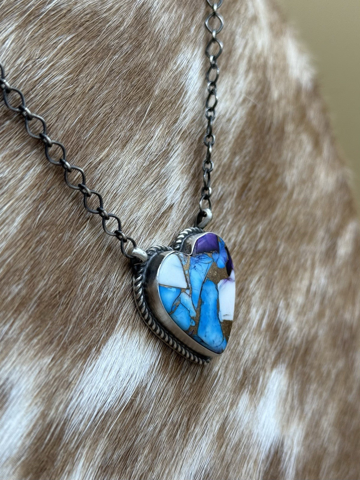 This exquisite necklace is a true work of art handcrafted by Native American artisan Tricia Smith, The stunning bar shaped necklace features a beautiful Violet rose and Blue dahlia stone (Compressed and dyed material). The pendant hangs on an 18-inch chain with lobster closure, making it a perfect accessory for any occasion.
