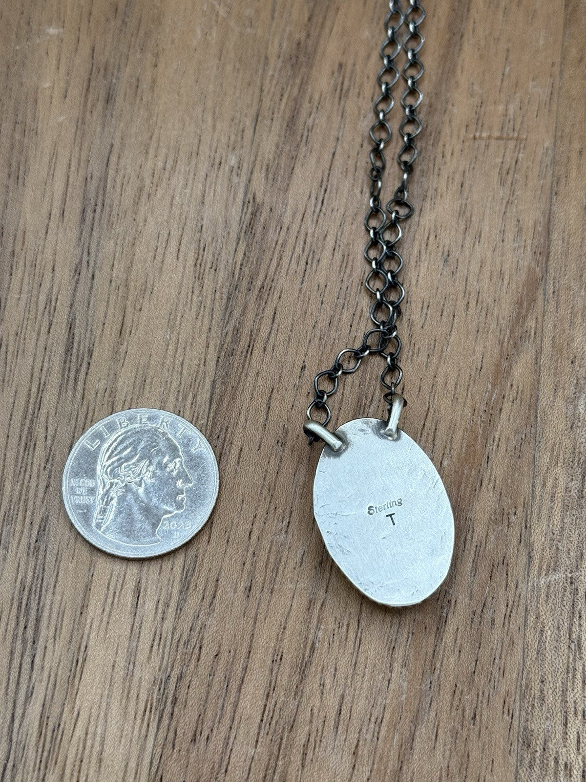 This exquisite necklace is a true work of art handcrafted by Native American artisan Tricia Smith, The stunning bar shaped necklace features a beautiful Violet rose and Blue dahlia stone (Compressed and dyed material). The pendant hangs on an 18-inch chain with lobster closure, making it a perfect accessory for any occasion.