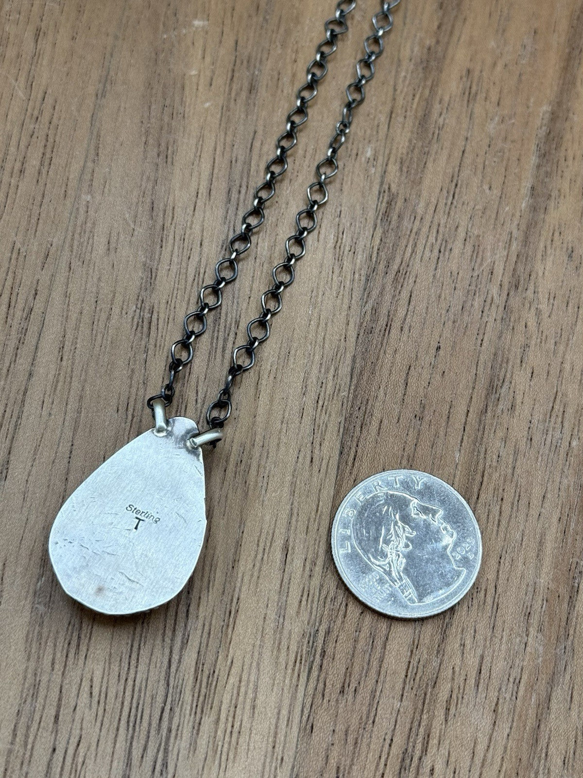 This exquisite necklace is a true work of art handcrafted by Native American artisan Tricia Smith, The stunning bar shaped necklace features a beautiful Violet rose and Blue dahlia stone (Compressed and dyed material). The pendant hangs on an 18-inch chain with lobster closure, making it a perfect accessory for any occasion.