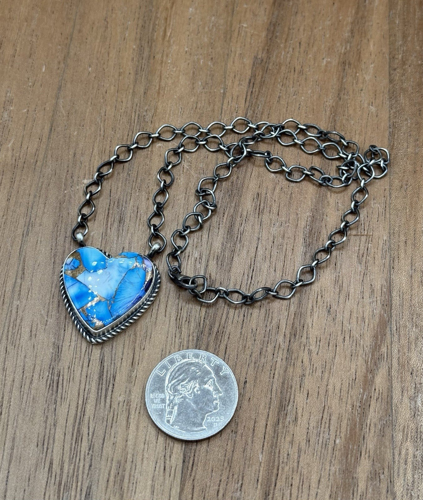 This exquisite necklace is a true work of art handcrafted by Native American artisan Tricia Smith, The stunning bar shaped necklace features a beautiful Violet rose and Blue dahlia stone (Compressed and dyed material). The pendant hangs on an 18-inch chain with lobster closure, making it a perfect accessory for any occasion.