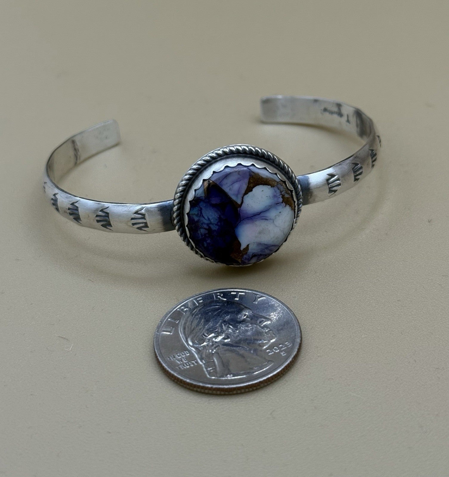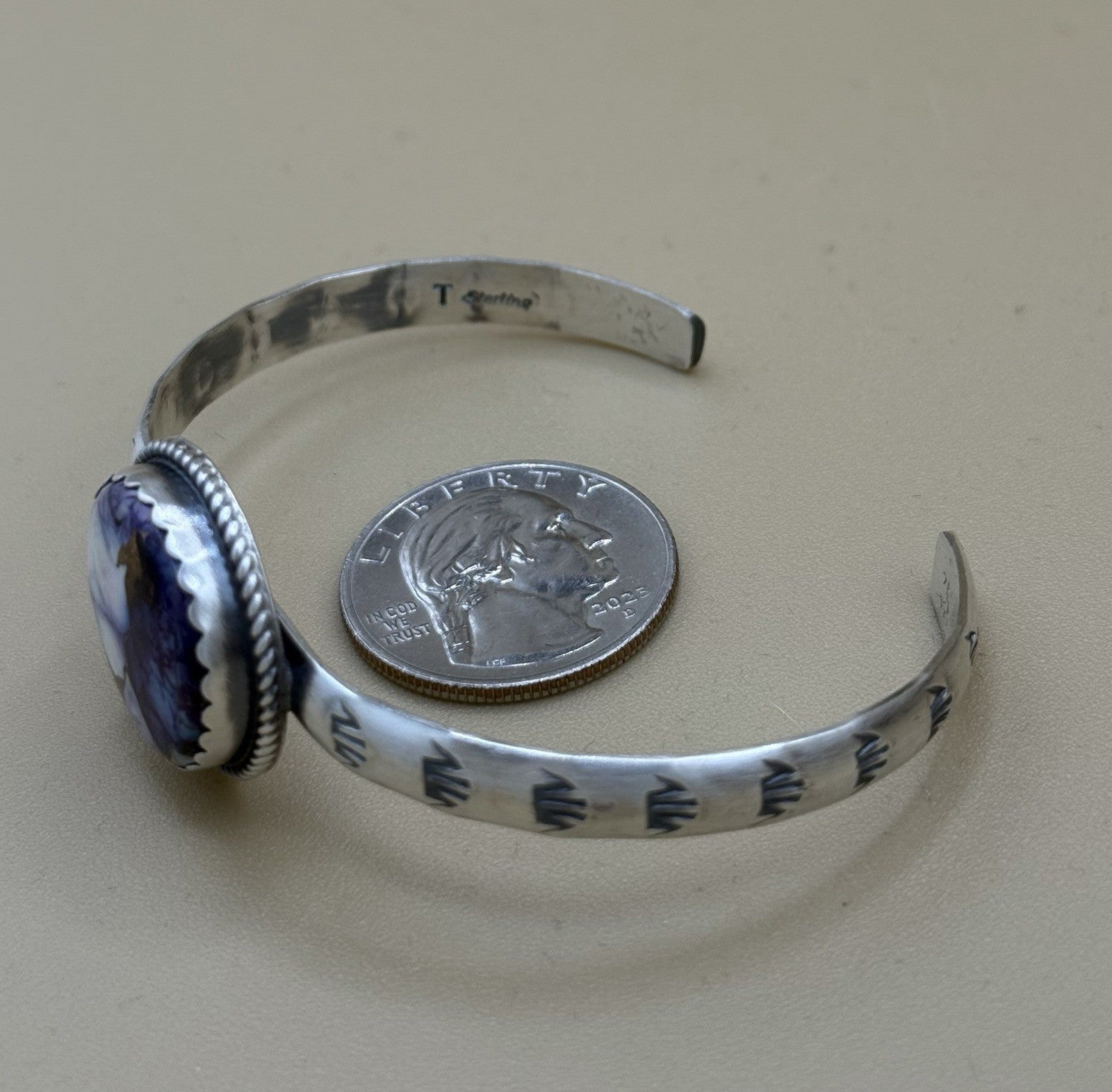 This Native American Navajo handmade cuff bracelet a features beautiful violet rose dahlia (dyed) stone. The intricate design and attention to detail make this bracelet a true beauty. The Navajo tribal affiliation adds to the authenticity and uniqueness of this piece.