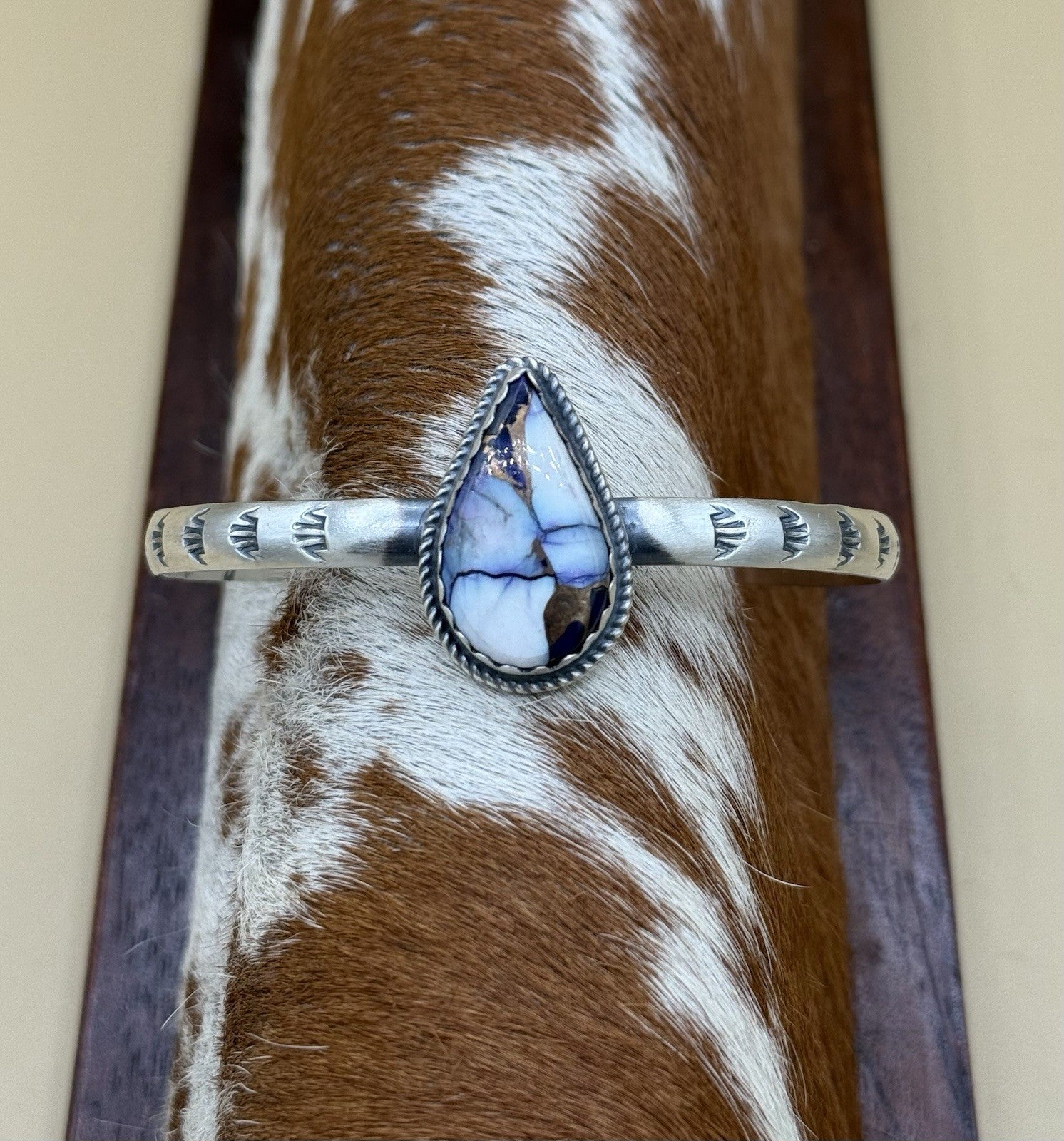 This Native American Navajo handmade cuff bracelet a features beautiful violet rose dahlia (dyed) stone. The intricate design and attention to detail make this bracelet a true beauty. The Navajo tribal affiliation adds to the authenticity and uniqueness of this piece.