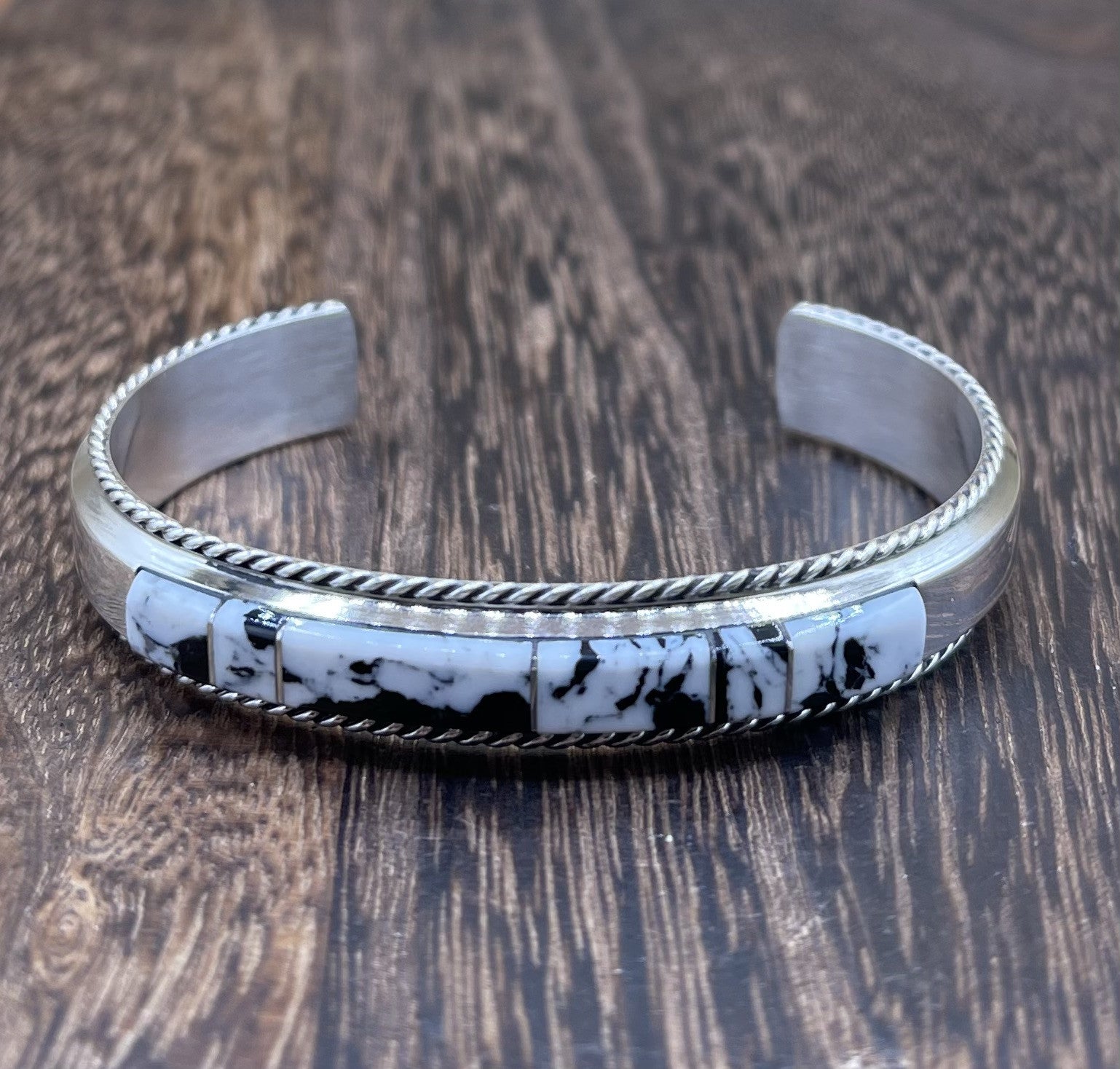 This exquisite Navajo handmade bracelet features a stunning inlay of White buffalo, set in sterling silver. The intricate design and expert craftsmanship make this piece a true work of art, perfect for any occasion from Mother's Day to weddings and birthdays. The rectangular shape and cuff style give it a modern, yet timeless look that will complement any outfit.