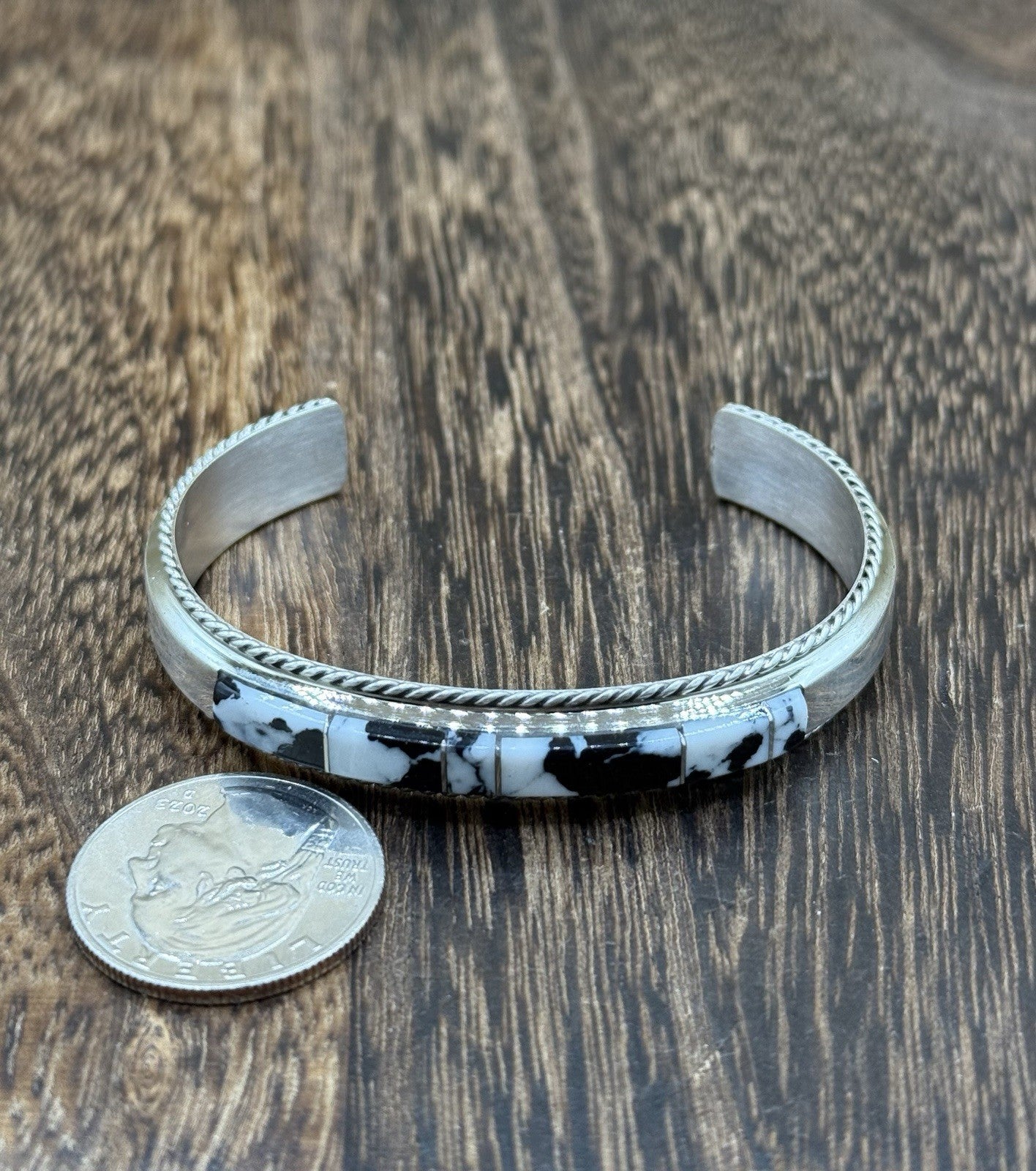 This exquisite Navajo handmade bracelet features a stunning inlay of White buffalo, set in sterling silver. The intricate design and expert craftsmanship make this piece a true work of art, perfect for any occasion from Mother's Day to weddings and birthdays. The rectangular shape and cuff style give it a modern, yet timeless look that will complement any outfit.