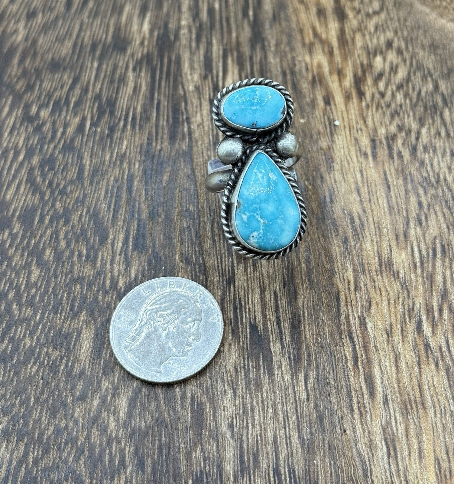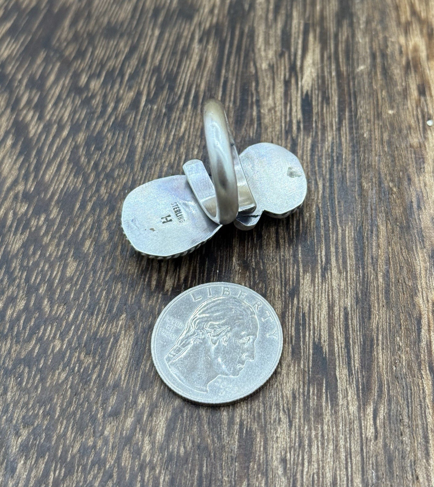 This is a handmade Native american ring made by Vicky Hicks. The ring is adorned with a white water turquoise stone. The ring is adjustable from size 7 to size 9