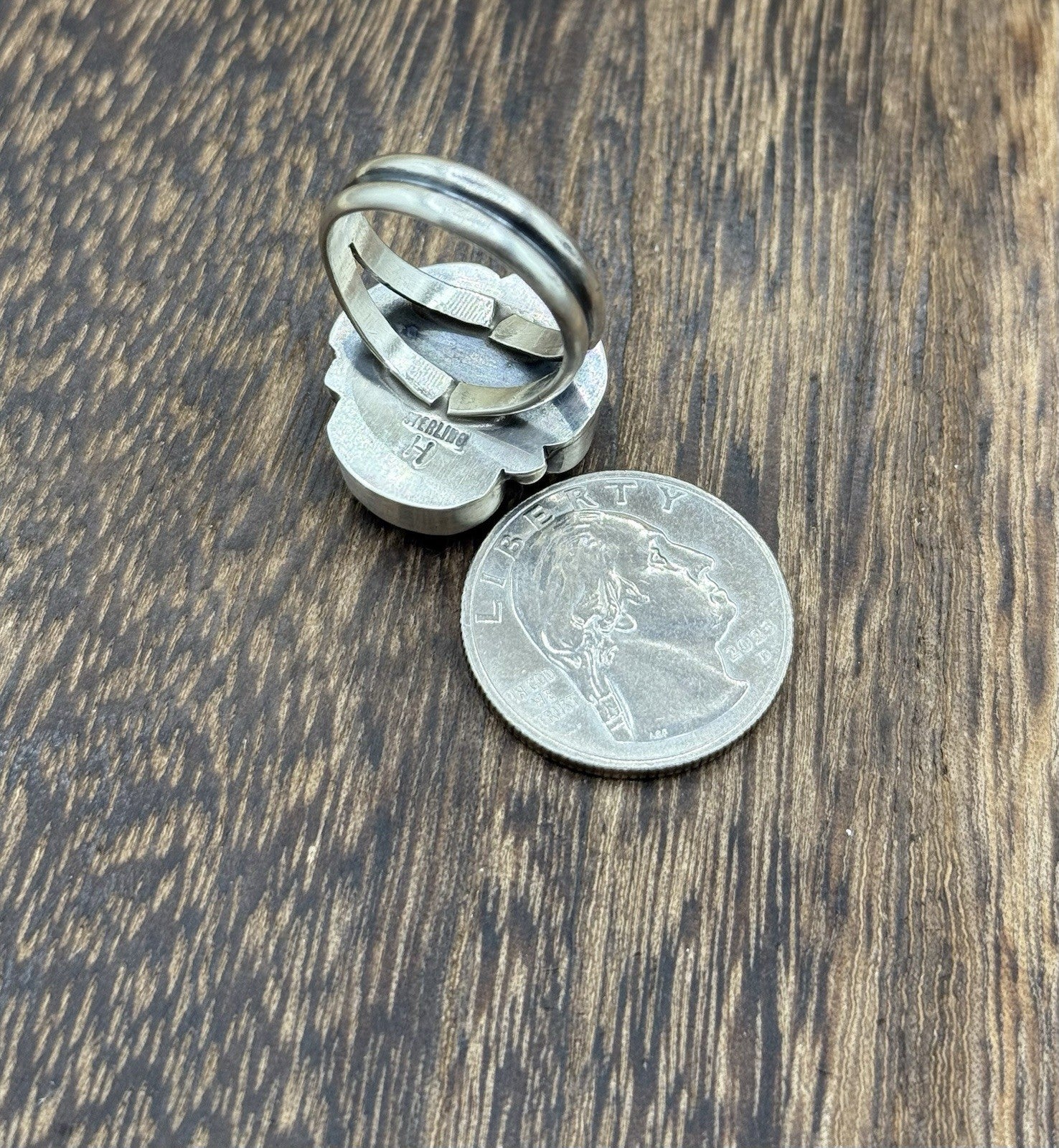 This is a handmade Native american ring made by artist Vicky Hicks. The ring is adorned with white water turquoise stones and sterling silver.
