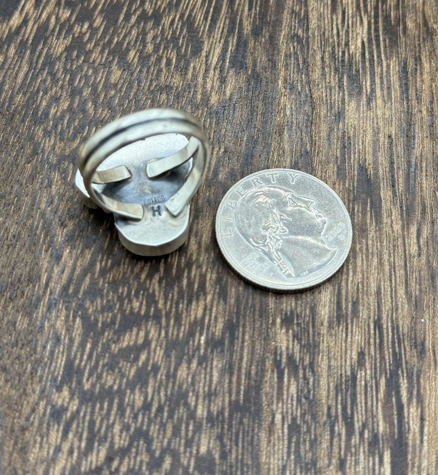 This is a handmade Native american ring made by artist Vicky Hicks. The ring is adorned with white water turquoise stones and sterling silver.