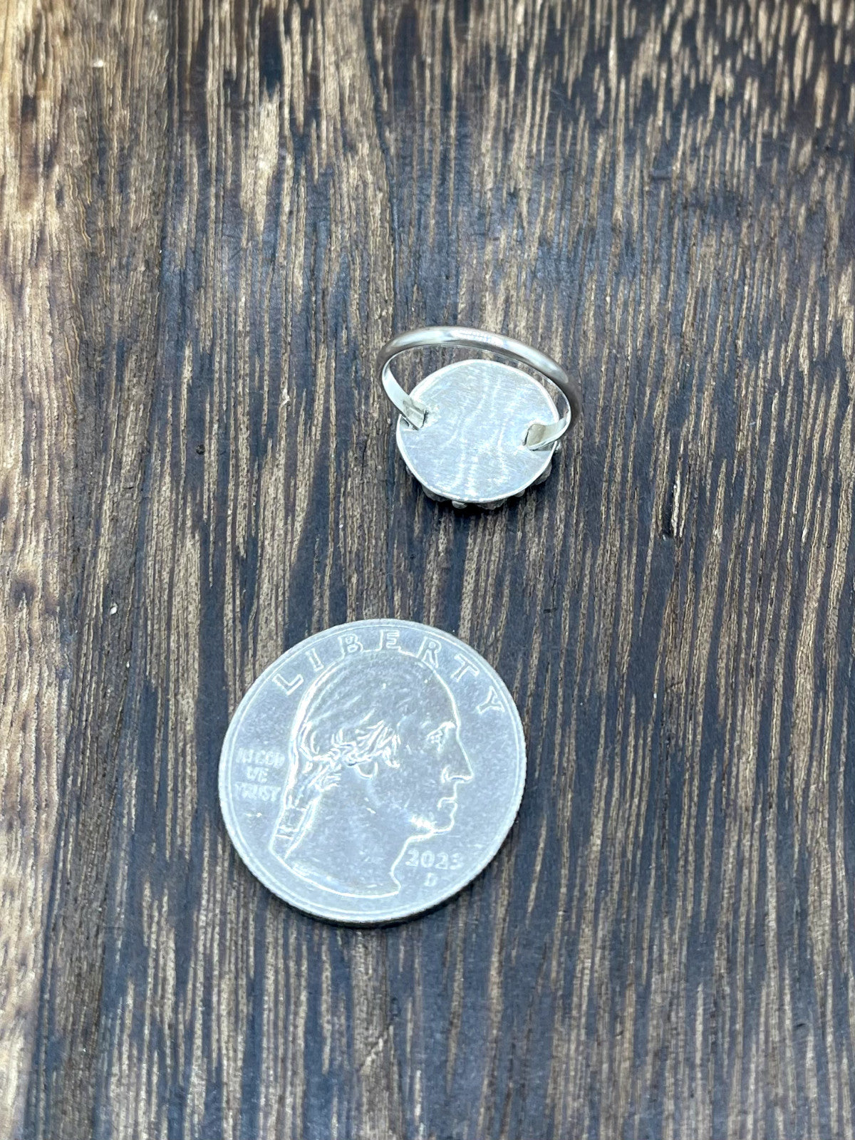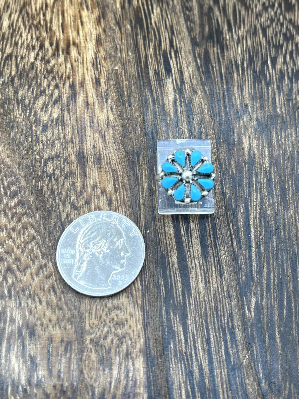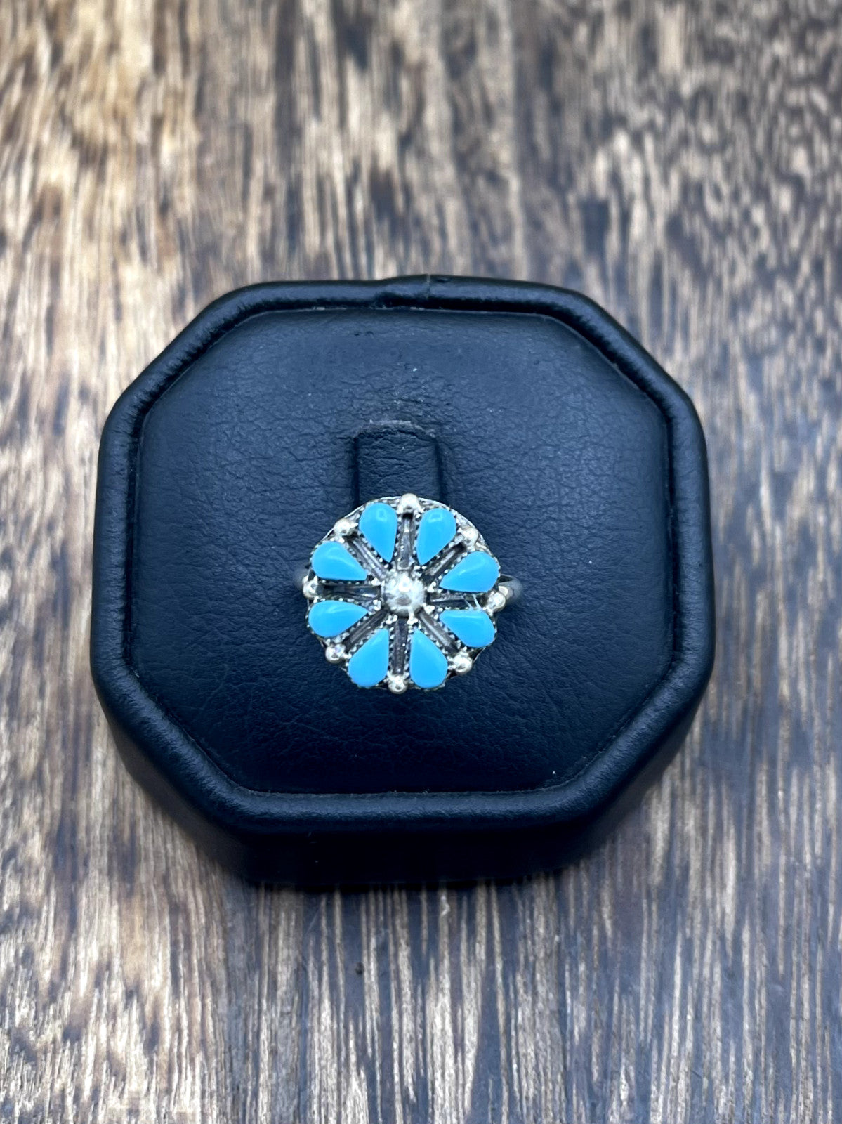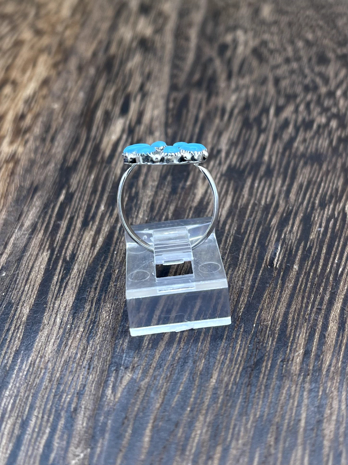 This Native American Zuni handmade sterling silver Kingman turquoise cluster ring is a beautiful piece of jewelry that will make a great addition to any collection. The ring features a Kingman Turquoise stone with an cluster design, making it perfect for everyday wear.